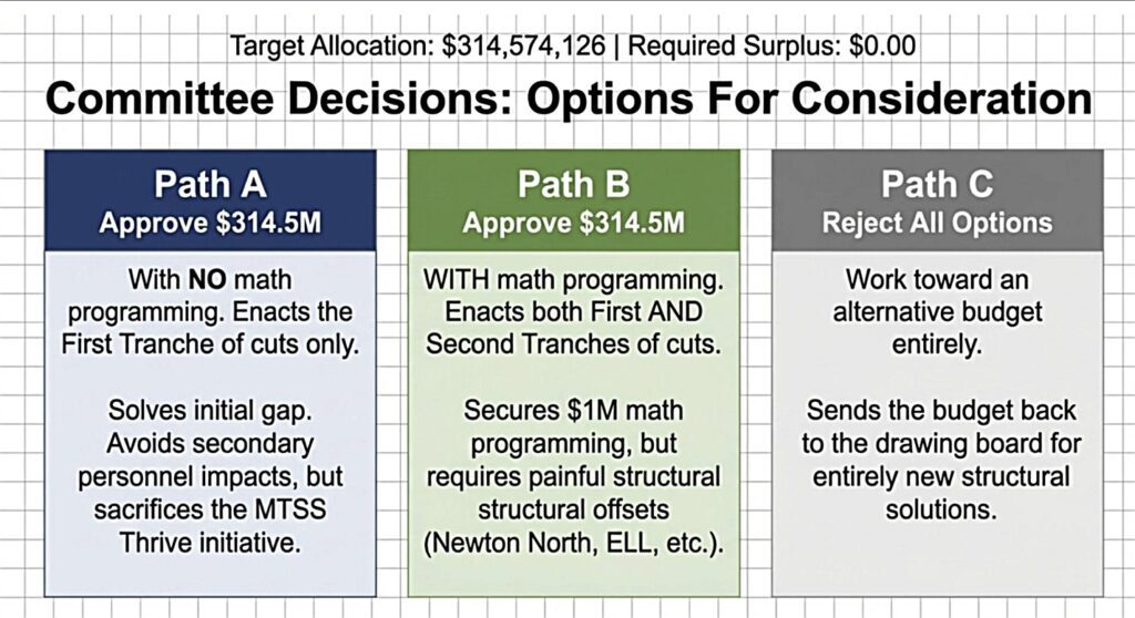 Several School Committee members and the Mayor advocated for Path B, which retains the math program redesign. They noted that weaknesses in Newton’s math program were frequently raised by voters during the campaign season, and that the redesign would be 0.3% of the entire NPS budget.