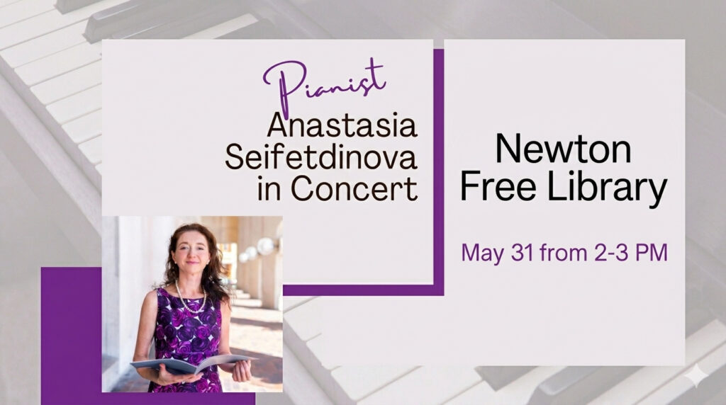 On Sunday, May 31 from 2-3PM, the Newton Free Library (330 Homer Street, Newton Centre) will host Pianist Anastasia Seifetdinova in Concert. Seifetdinova will perform an engaging program of Romantic piano music by Brahms and Schumann as well as by Ukrainian composers from the 20th century, Revutsky and Lyatoshinsky.