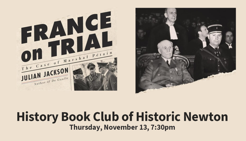The History Book Club of Historic Newton will meet virtually on Thursday, November13 at 7:30PM to discuss France on Trial by Julian Jackson. Read the book in advance and join the meeting, which is held on Zoom and is free and open to all. To receive book club updates and Zoom links,…