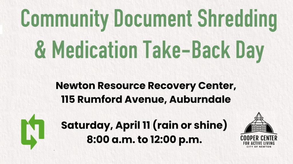 Shred your documents and/or dispose of unused prescription medication on Saturday, April 11 (rain or shine) from 8AM – 12PM at Newton’s Resource Recovery Center (115 Rumford Ave, Auburndale). There is no cost to participate. However, donations to the Cooper Center are appreciated. A $10+ donation (cash or check) can…