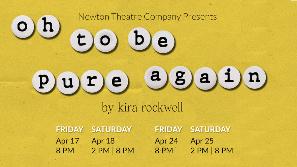 Newton Theater Company presents Oh to be Pure Again! at St. John’s Episcopal Church, DiMauro Hall (96 Otis Street, Newtonville) on Apr17-18 and Apr 24-25. Seating is intimate and limited, so get your tickets soon!
