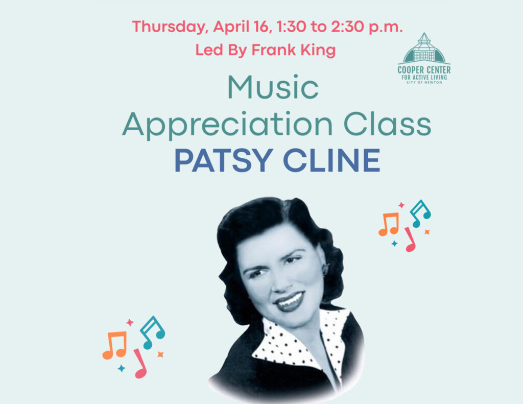 Frank King will deliver a lecture on the one and only Patsy Kline at the Cooper Center (345 Walnut Street, Newtonville) on Thursday, April 16 from 1:30-2:30PM. King will focus on the gorgeous recordings and tragic life of Patsy Cline, considered to possess one of the most beautiful voices of…