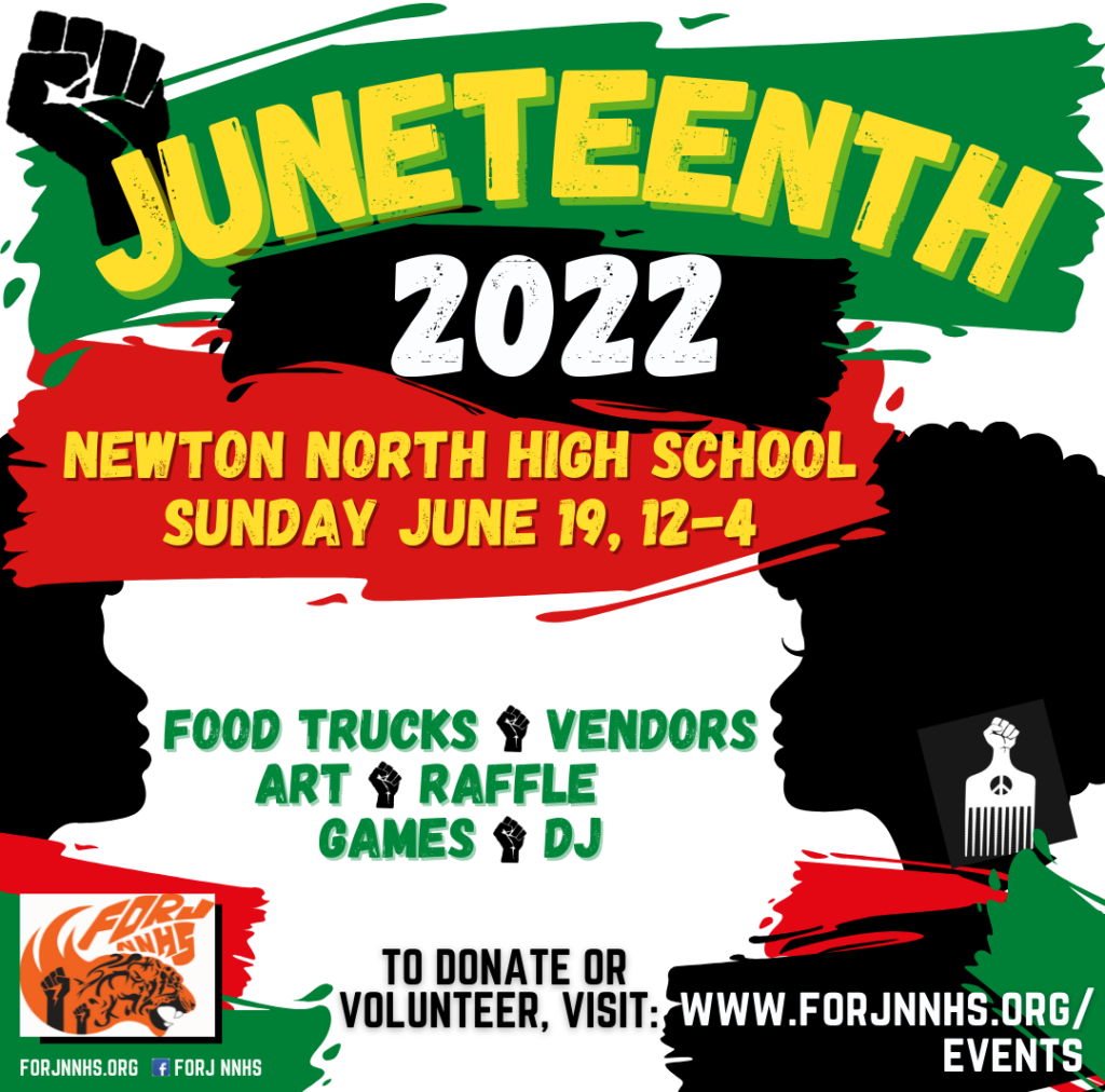 FORJ NNHS (Families Organizing for Racial Justice at Newton North High School) is hosting this year’s Juneteenth Celebration at the Walnut Street side of Newton North High School. The event will host Black-owned businesses, food trucks, performers, and children’s activities. In addition, The New Art Center will be hosting a performance of Frederick Douglass’s…
