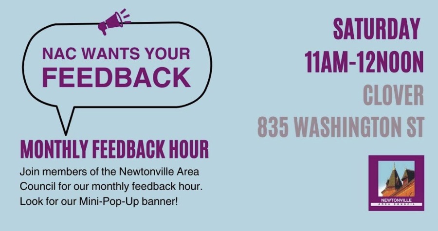 The Newtonville Area Council holds Listening Hours monthly, alternating between Clover (855 Washington Street) and Caffè Nero (28 Austin Street) in Newtonville. Next one is 11AM-Noon at Clover. Come and provide your feedback.