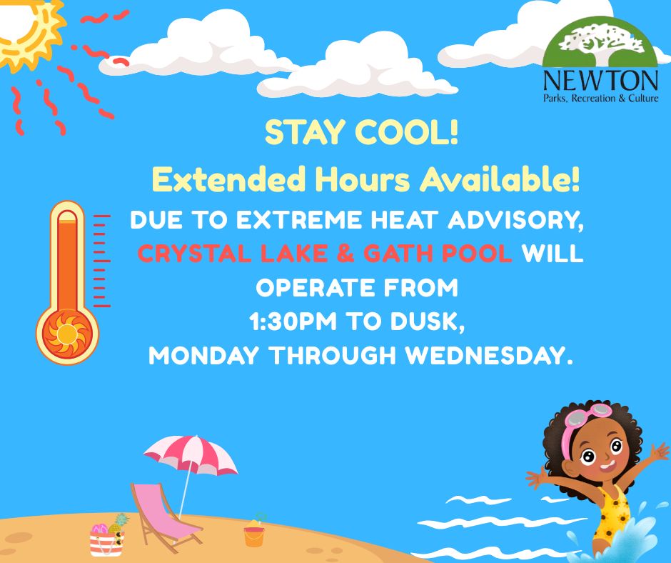 During the heat advisory (Monday-Wednesday, June 23-25), both Crystal Lake and Gath Pool will be open for swimming 1:30PM to Dusk.