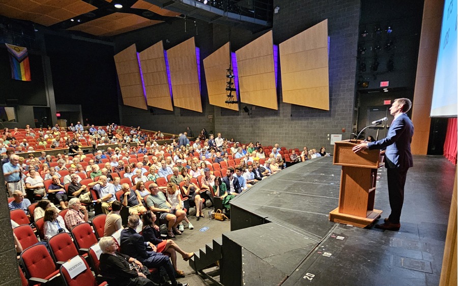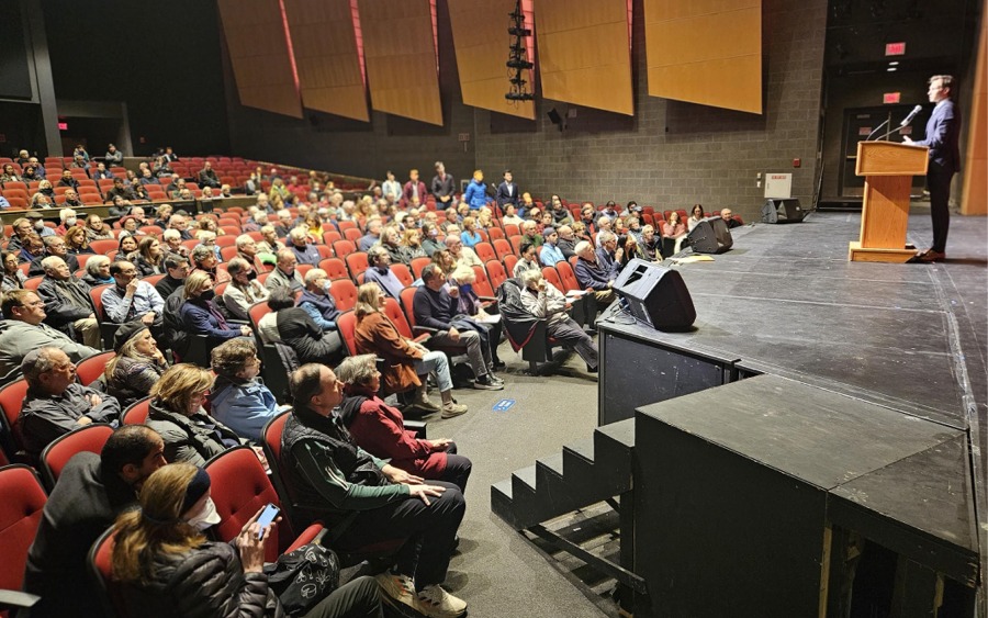 Responding to an invitation from Rep. Jake Auchincloss (MA 4th CD), approximately 400 people took seats in Newton North High School’s theatre to hear and engage with him. According to his staff, over 600 people had said they planned to attend the Sunday afternoon event, among them local elected officials…