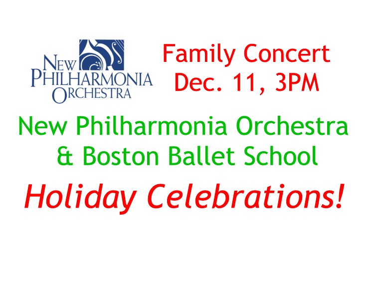 The New Philharmonia Orchestra and the Boston Ballet School will present Holiday Celebrations!, featuring music and dances from Tchaikovsky’s Nutcracker Suite, on December 11 at 3PM at Brown Middle School (125 Meadowbrook Road). Tickets are $20 for adults and $10 for students (under 25).