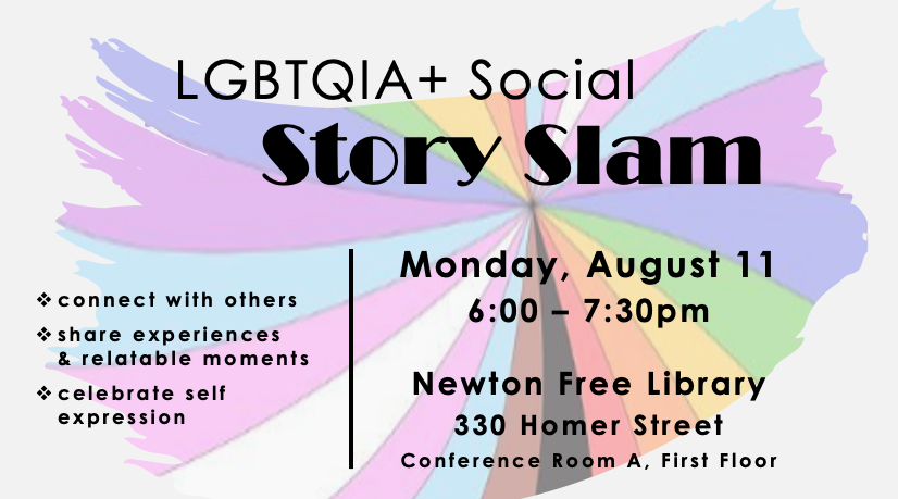 The Cooper Center for Active Living in Newton in collaboration with the Newton Free Library hosts monthly LGBTQIA+ socials. The next will be on Monday, August 11, 6PM-7:30PM in Conference Room A on the first floor of the Newton Free Library. It will be an LGBT-themed Story Slam! Come prepared…