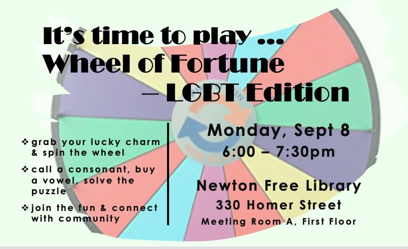 Older Adult Services and the Newton Free Library are jointly sponsoring this month’s LGBTQIA+ Social event — Wheel of Fortune – LGBT Edition! — on Monday, September 8, 6PM-7:30PM in Meeting Room A (first floor) of the Newton Free Library (330 Homer Street). Spin the wheel to play a version of the…