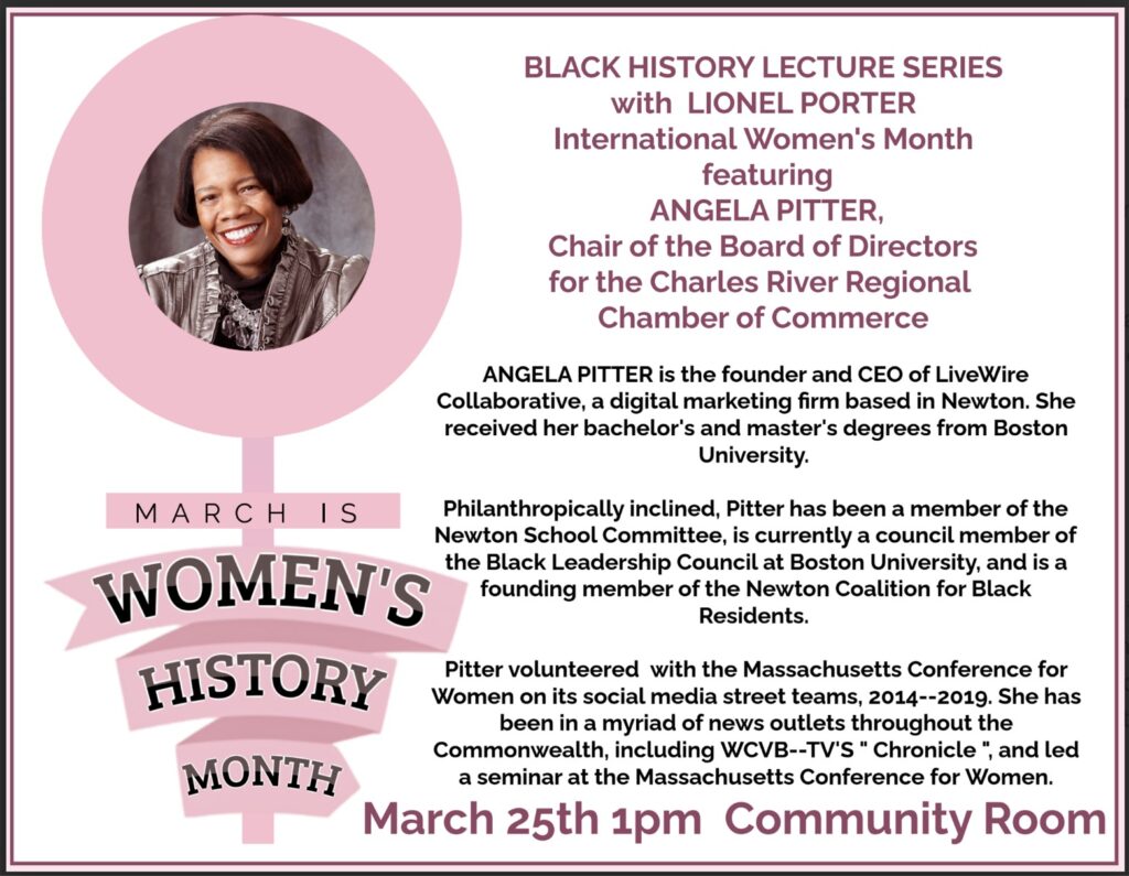 Angela Pitter will be the featured speaker in Cabot Park Village’s Black History Lecture Series on March 25 at 1PM in the Community Room of Cabot Park Village (280 Newtonville Avenue, Newtonville). She the founder and CEO of LiveWire Collaborative, a digital marketing firm based in Newton. She received her…