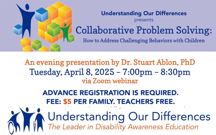 Understanding Our Differences will present an evening webinar — Collaborative Problem Solving: How to Address Challenging Behaviors with Children — on Tuesday, April 8 at 7PM. Advance registration is required. Presenter Dr. Stuart Ablon — Founding Director of Think:Kids in the Department of Psychiatry at MGH, who is recognized globally…