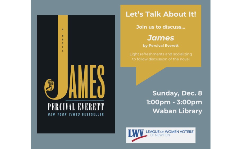 The League of Women Voters of Newton invites all community members for an intimate gathering and book group discussion on the novel, James, by Percival Everett on Sunday, December 8, 1PM-3PM, at the Waban Library Center (1608 Beacon Street, Newton). James is a brilliant, action-packed reimagining of The Adventures of Huckleberry Finn, both harrowing and…