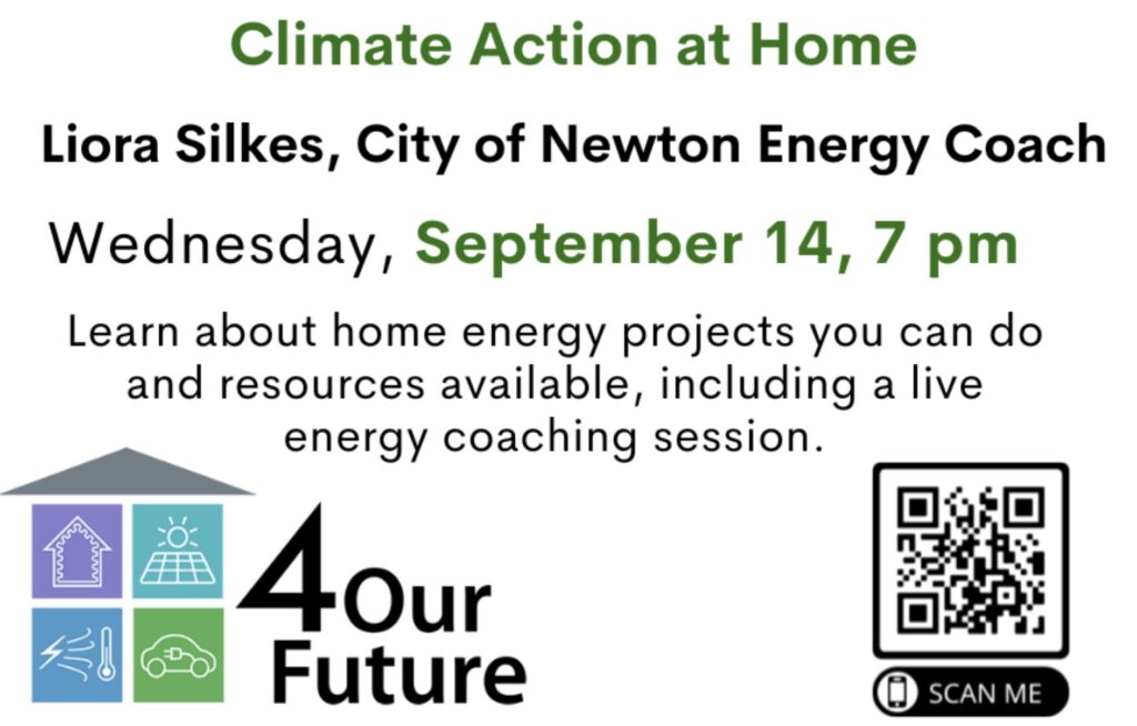 On September 14 at 7PM, City of Newton Energy Coach Liora Silkes will present a webinar, Planning for Our Future: Climate Action at Home, to discuss home energy projects and resources available to reduce the climate impact of our homes. The event will include a live energy-coaching session. Register at…