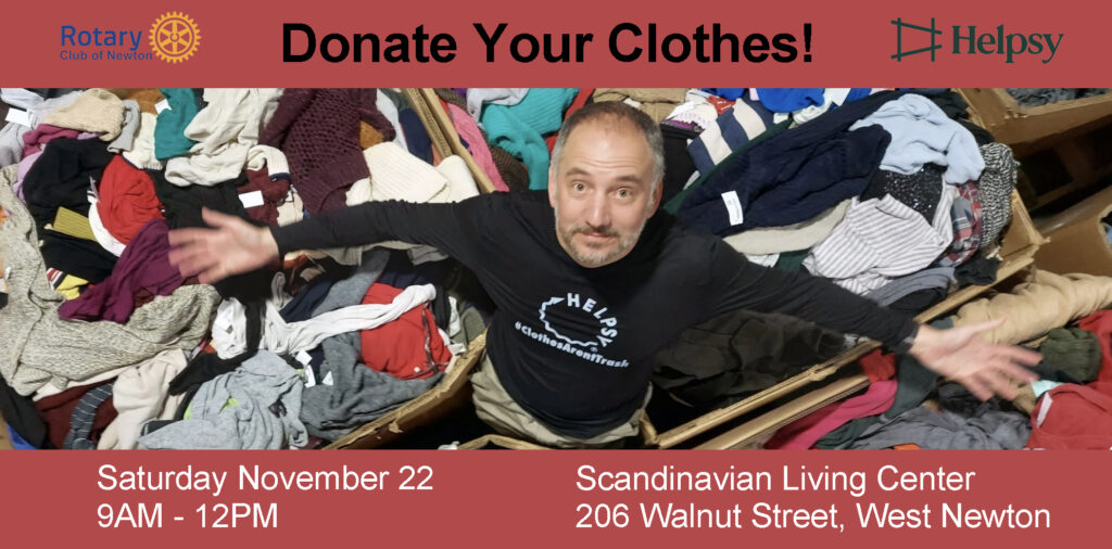 The Newton Rotary Club will be holding its last Helpsy clothing drive of 2025 at the Scandinavian Living Center (206 Waltham Street, West Newton) on Saturday, November 22 from 9AM – 12PM. The Rotary is working with Helpsy, which accepts clothing and textiles in any clean condition (see details). This…