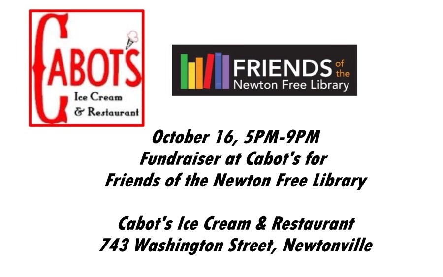 On October 15, 5PM-9PM, Cabot’s Ice Cream & Restaurant (743 Washington Street, Newtonville) will donate a portion of its revenue for a fundraiser for the Friends of the Newton Free Library, to help enable the Friends to continue supporting programming at the library.