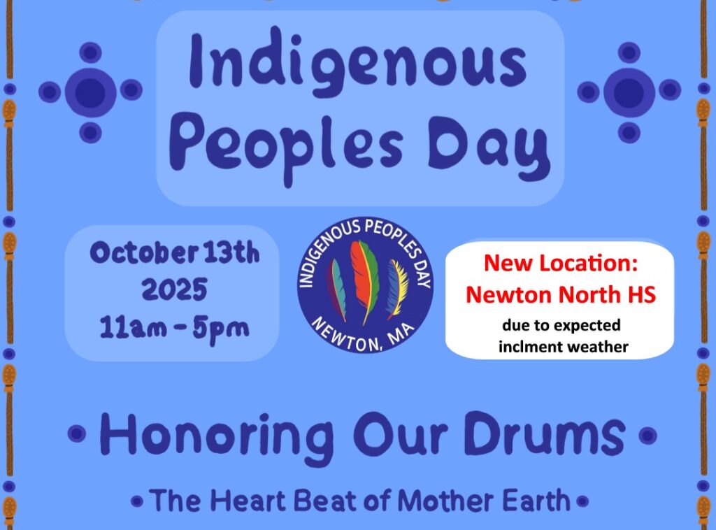 Newton’s 5th annual Ceremonial Celebration of Indigenous Peoples Day will be held on Monday, October 13 from 11AM to 5PM — NOT at Albemarle Field but at NEWTON NORTH HIGH SCHOOL (due to expected inclement weather). Dedicated this year to the drum — the heartbeat of Indigenous Nations and Mother…