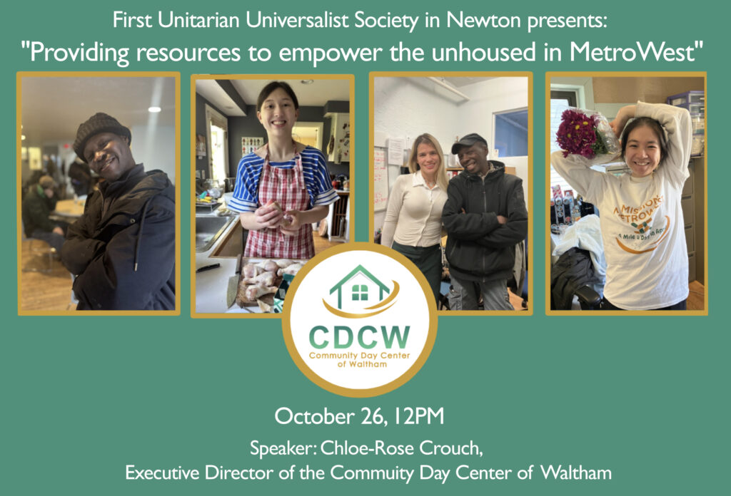 Everyone is invited to the monthly Social Justice Speaker (and free lunch) at First UU Society (1326 Washington Street, West Newton) on Sunday, October 26 at 12PM. This month, Chloe-Rose Crouch will speak about her work as Executive Director of the Community Day Center of Waltham, which has the highest…