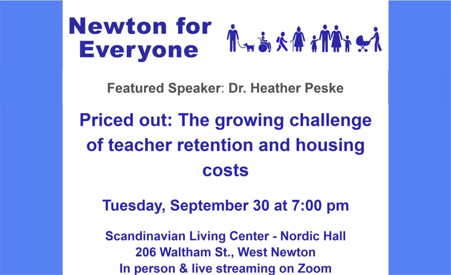 Newton for Everyone will host a talk, Priced out: The growing challenge of teacher retention and housing costs, on September 30 at 7PM in-person at the Scandinavian Living Center’s Nordic Hall (206 Waltham Street, West Newton) and via Zoom. Register to attend in-person or by Zoom. Heather Peske, president of…