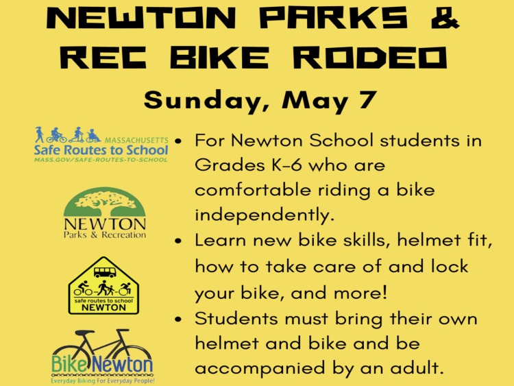 Newton’s 3rd Annual Bike Rodeo will be held May 7, 10AM-2PM, at Newton South High School (140 Brandeis Road). Volunteer instructors from Newton’s Safe Routes to Schools Task Force will teach and review bike riding skills. Along with volunteers from Bike Newton, they will provide information about road signs, hand…