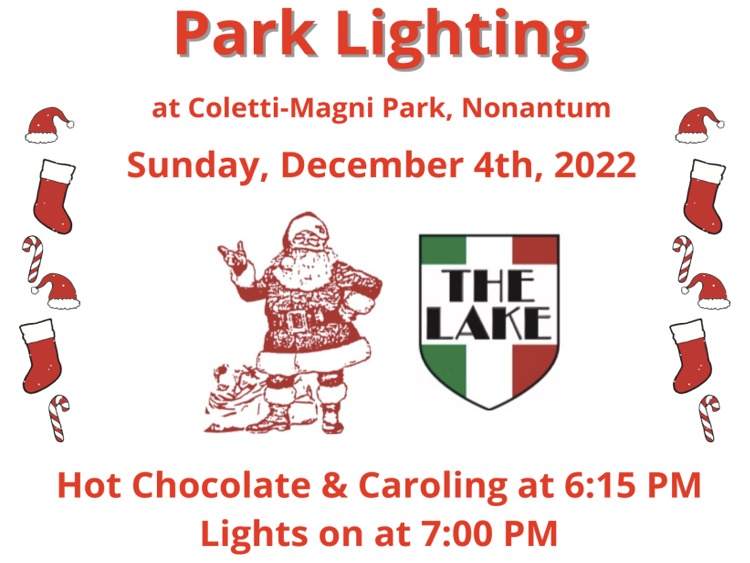 The Nonantum Children’s Christmas Party Association will hold its annual Park Lighting celebration at Coletti-Magni Park on Sunday, December 4 with hot chocolate and caroling at 6:15PM and the park lights turned on at 7PM.