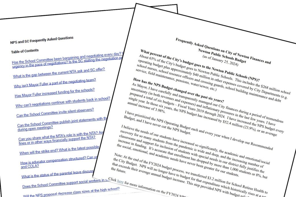 On the morning of January 28, the School Committee and Mayor Ruthanne Fuller each published detailed Frequently Asked Questions (FAQ) documents responding to questions about the Teachers Strike and City finances. NPS and SC Frequently Asked Questions, issued by the School Committee, addresses 21 questions in a Google Doc that…