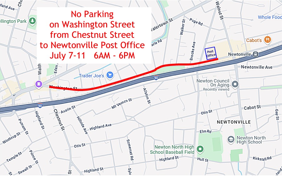 To accommodate construction work for the Washington Street Pilot, there will be NO PARKING allowed (TOW ZONE) on Washington Street, from Chestnut Street to Washington Terrace (just east of the Newtonville Post Office) from 6AM to 6PM, July 7-11, per Newton Police notice.