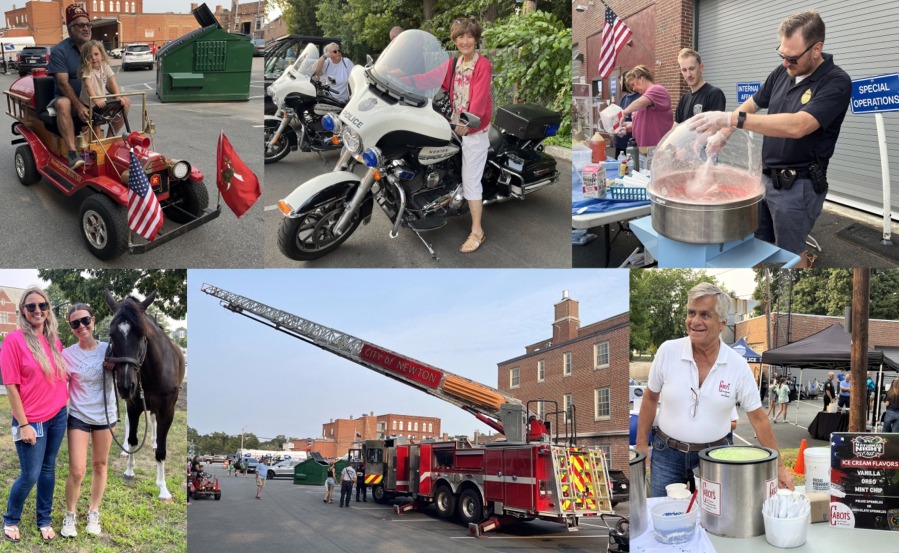Honking as he passed by, Savvas Fotiadis and his young passenger carefully drove a mini fire engine around the crowd at the Newton Police’s National Night Out event on Aug. 5, in West Newton. Donning a red fez, Fotiadis and other members of the Worcester County Shriners Club gave rides…