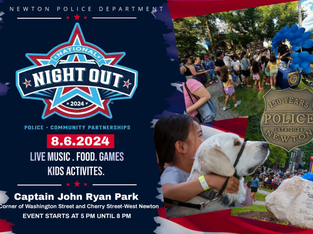Newton Police Department is celebrating National Night Out with live music, food, games, touch-a-truck, and other activities. It will take place on Tuesday, August 6, 5-8PM at Captain Ryan Park next to Police Headquarters (1321 Washington St, West Newton).