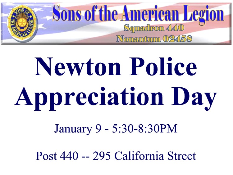 In conjunction with National Law Enforcement Appreciation Day, the Sons of the American Legion will host the eighth annual Newton Police Appreciation Day on Monday, January 9, 5:30PM-8:30PM at the American Legion Post 440 (295 California Street, Newton). The event is free and open to the public – to recognize…