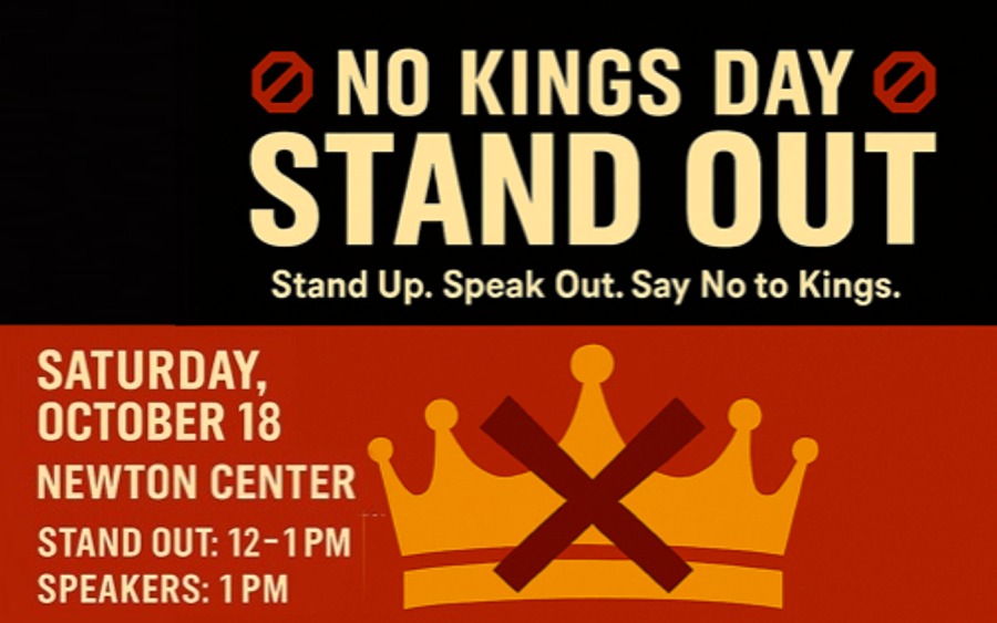 Newton Indivisible is organizing the second Newton’s No Kings Day — a visibility event with speakers — on Newton Centre Green (corner of Centre and Beacon Streets) on Saturday, October 18, Noon to 1:30PM. A core principle behind all No Kings events is a commitment to nonviolent action.