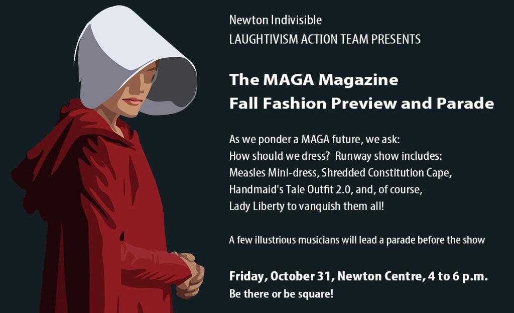 This Halloween — Friday, October 31 — turn fear into fashion at the Indivisible MAGA Magazine Fall Preview Fashion Show & Parade at the Newton Centre Common from 4-6PM. The event is a satirical runway event bringing together creativity, costume, and civic awareness. Wear a costume that dramatizes a scary consequence of…