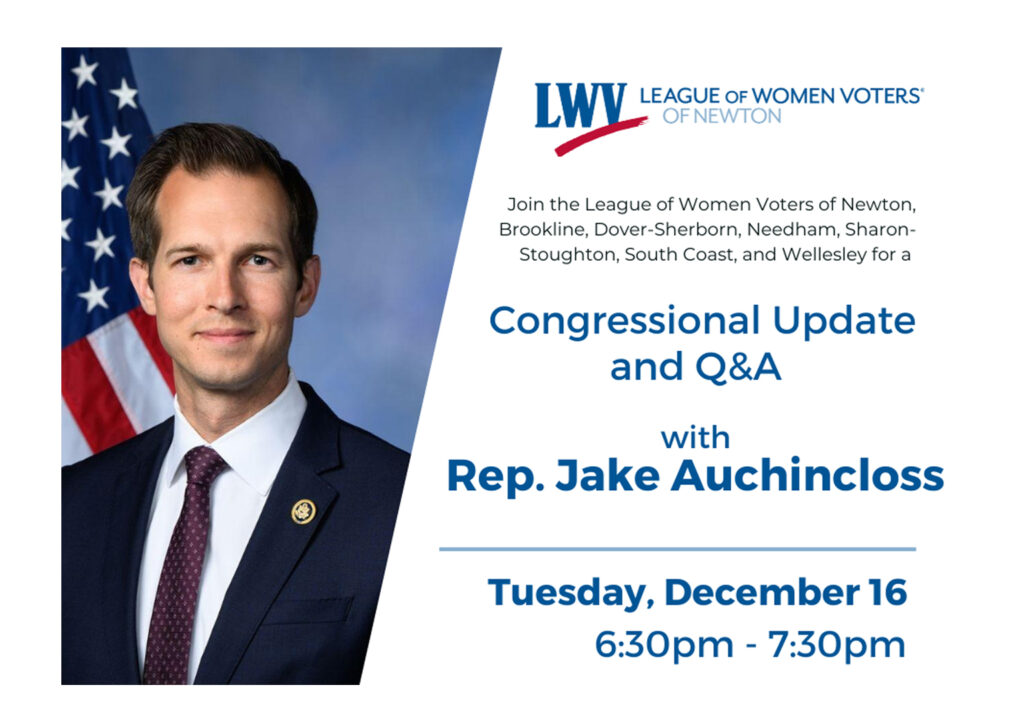 The League of Women Voters of Newton, Brookline, Dover-Sherborn, Needham, Sharon-Stoughton and Wellesley invite you to join them on Tuesday, Dec. 16 from 6:30-7:30PM on Zoom, for a Congressional Update and Q& A with Congressman Jake Auchincloss of Massachusetts’ 4th Congressional District. Congressman Auchincloss will discuss recent events happening in the…