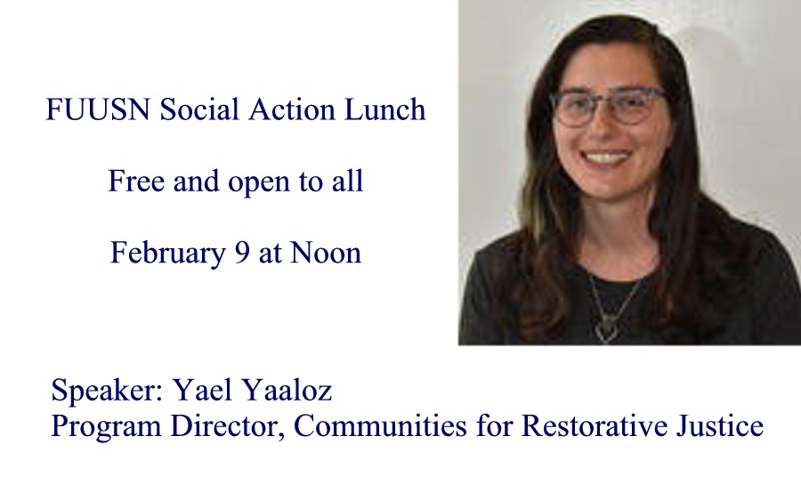 The First Unitarian Universalist Society in Newton (FUUSN) hosts a monthly free lunch with a different social-action speaker each month at FUUSN (1326 Washington Street, West Newton). At noon on February 9, the speaker will be Yael Yaaloz, Program Director at Communities for Restorative Justice (C4RJ). From FUUSN: Yael Yaaloz will speak…