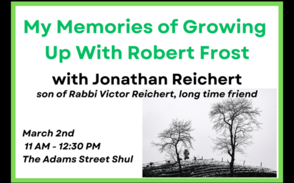 The Adams Street Shul will present an event, My Memories of Growing Up with Robert Frost, where Jonathan Reichert will share his memories and insights into famous poet Robert Frost. This will take place on Sunday, March 2, 11AM-12:30PM, and can be attended via Zoom or in-person at the Adams…