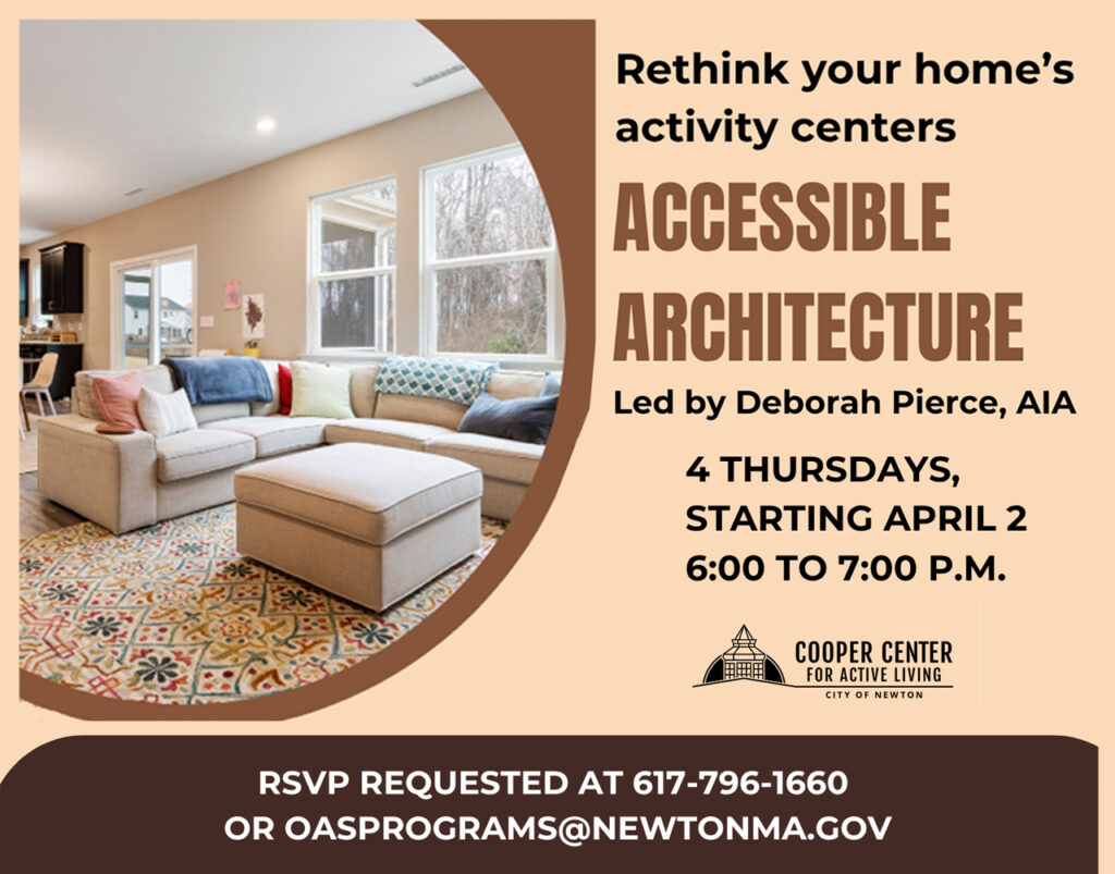 The Cooper Center (345 Walnut Street, Newtonville) will host Accessible Architecture — a series of lectures and small group activities led by Deborah Pierce. The program will take place on four Thursdays in April — April 2, 9, 16, 23 — from 6 to 7PM. Today’s homes were designed for…
