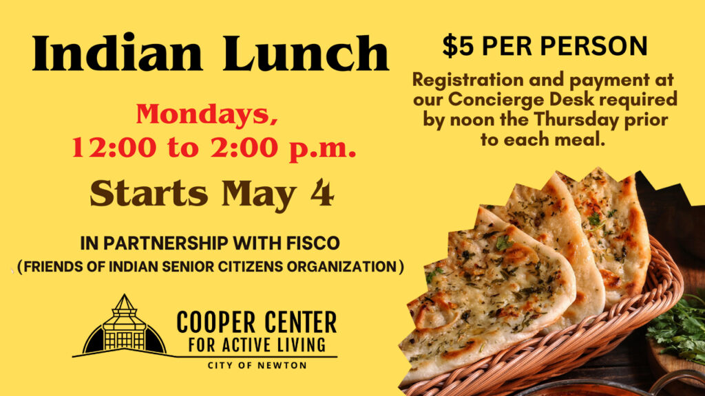 Enjoy an Indian lunch from a local restaurant on Mondays starting with a kick-off event on Monday, May 4 from 12-2PM in the Multipurpose Room at the Cooper Center (345 Walnut Street, Newtonville). $5 per person. Pre-registration and payment required at the Cooper Center Concierge Desk by noon on the…
