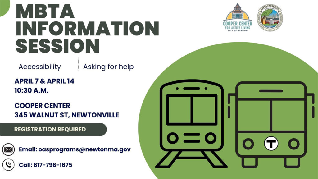 Staff from the MBTA Mobility Center will visit the Cooper Center (345 Walnut Street, Newtonville) to talk about essential MBTA features. On Tuesday, April 7 at 10:30AM, the focus will be on accessibility and navigating the T. On Tuesday, April 14 at 10:30AM, the focus will be on safety and…