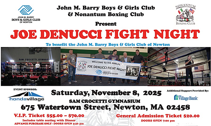 The John M. Barry Boys & Girls Club and the Nonantum Boxing Club will present Joe DeNucci Fight Night on November 8 at 7PM in the Sam Crocetti Gymnasium at the Boys & Girls Club (675 Watertown Street, West Newton). Proceeds benefit the John M. Barry Boys & Girls Club.…