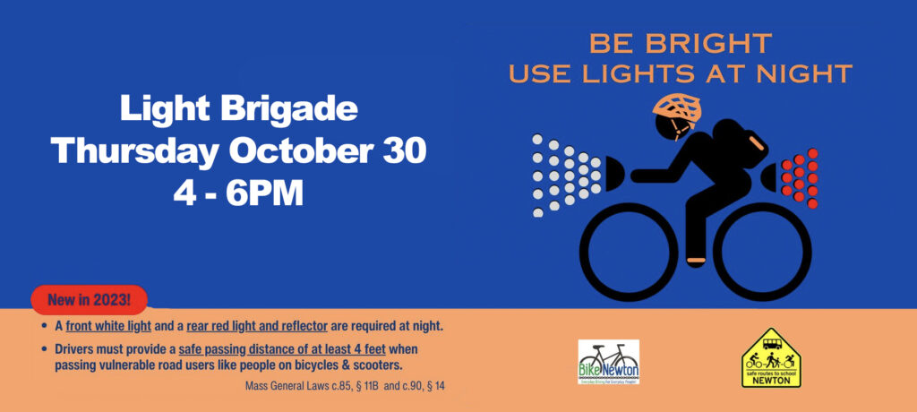 Join Bike Newton for a Light Brigade on Thursday October 30 from 4-6PM at the Washington Street Bike Lane, at the Walker Street Dog Park. There will be give-aways, and cruising up and down the new Washington St. Bike Lane. They will be making sure you are all set for…