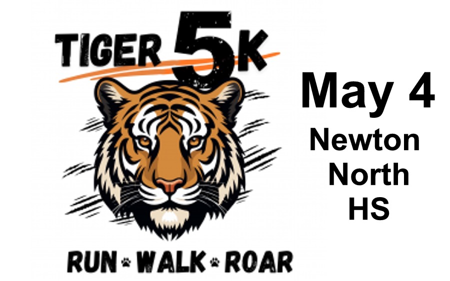 Sign to walk or run in the inaugural Tiger 5K hosted by the Newton North Boosters on May 4 at 8:30AM to benefit Newton North HS Athletics. The course begins and ends at Newton North High School. Register by April 15 to get a shirt.