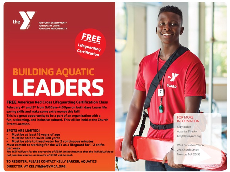 The West Suburban YMCA is offering a FREE American Red Cross Lifeguarding Certification Class on February 4 and 5, 9AM-4PM both days, at its Church Street location in Newton Corner. Learn valuable life-saving skills and make some extra money, too. Join a fun, welcoming, and inclusive organization as a lifeguard…