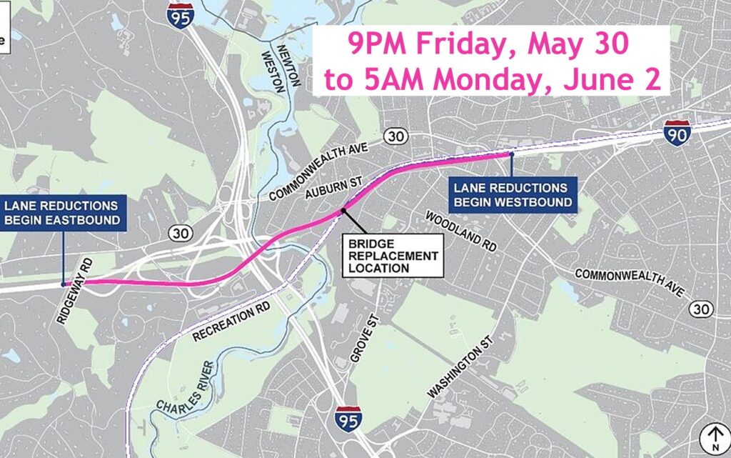 From 9PM Friday, May 30 to 5AM Monday, June 2, the Mass Pike (I-90) will be reduced to one lane in each direction between Exit 123 (I-95 / Rte 128) and Exit 125 (Newton Corner) to facilitate a key part of MassDOT’s major construction project to replace eight Mass Pike bridges near the…