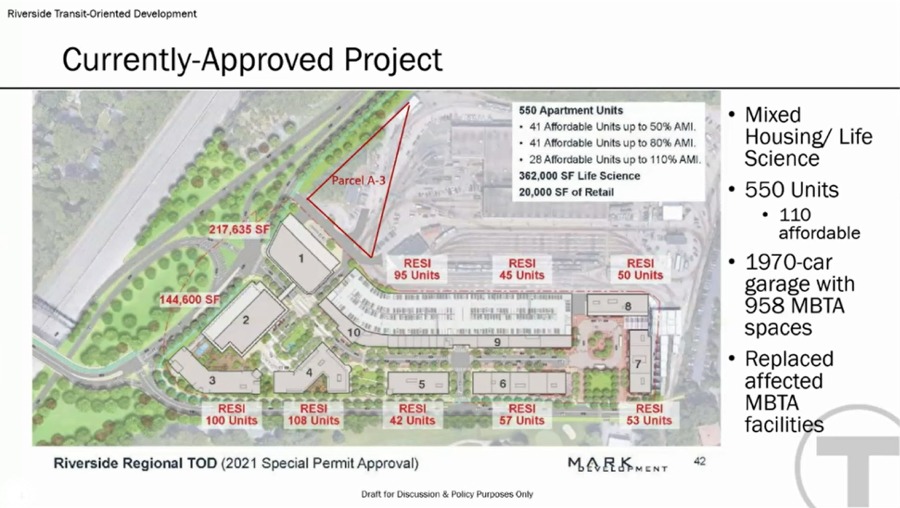 Mark Development has proposed a revised design for its development project at the MBTA Riverside Station, replacing commercial elements with more residential space. The original (and currently approved) design is a mix of residential, retail, and commercial space — including two large buildings for life sciences, 550 housing units, and…