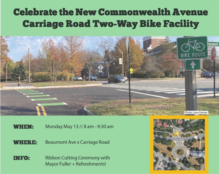 On the morning of May 13, bike enthusiasts and City employees and officials gathered for a ribbon cutting to celebrate the opening of the Two-Way Bike Facility on the Carriage Road paralleling Commonwealth Avenue. As Jane Hanser noted, this achievement is the result of work started in 2011 to improve…