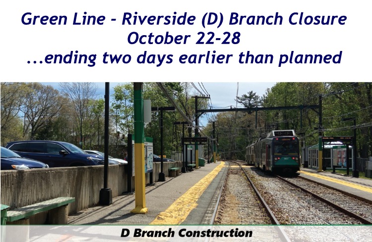The third (and last scheduled) temporary closure the MBTA Green Line Riverside (D) branch will end two days earlier than scheduled! The line will be down October 22-28 between Kenmore and Riverside stations. Shuttle buses will again run along the route (except for Beaconsfield), and parking lots at Waban and…