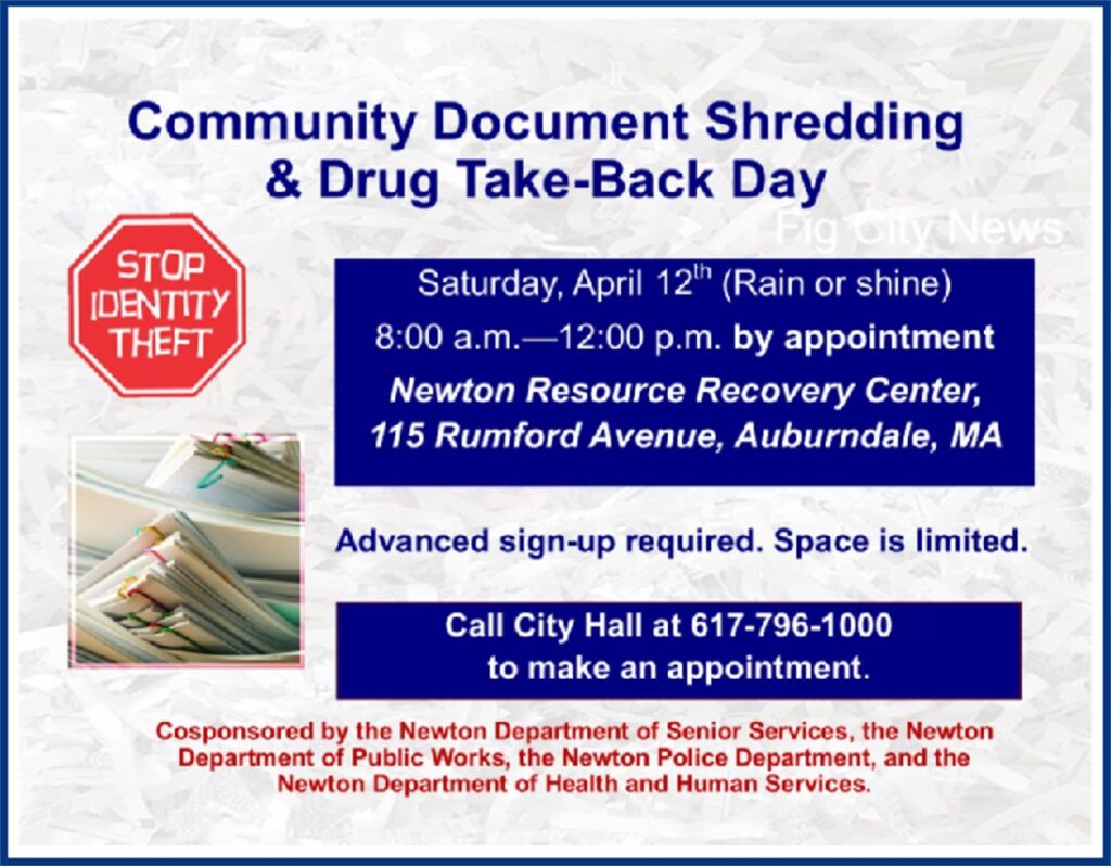 Newton’s free Community Document Shredding and Drug Take-Back event will be on Saturday, April 12, 8AM-12 noon at the Newton Resource Recovery Center (115 Rumford Avenue, Auburndale). Details on this page. Shredding is by appointment only. Call City Hall at 617-796-1000 to make an appointment. Restrictions: Drug Take-Back: Old or unused prescription medications…
