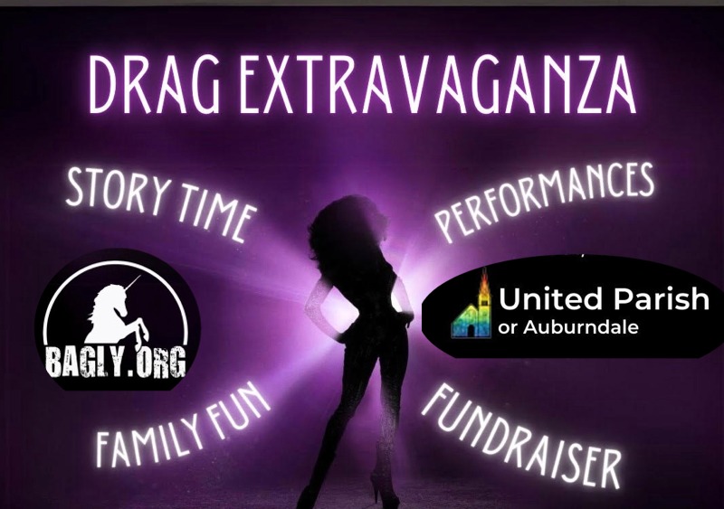 The United Parish of Auburndale (64 Hancock Street, Auburndale) will present Drag Extravaganza — a kid-friendly drag show — on September 21, 4PM-5:30PM as a fundraiser for the Boston Alliance of Gay, Lesbian, Bisexual and Transgender Youth (BAGLY). The program includes performances in the sanctuary, story times with children in…