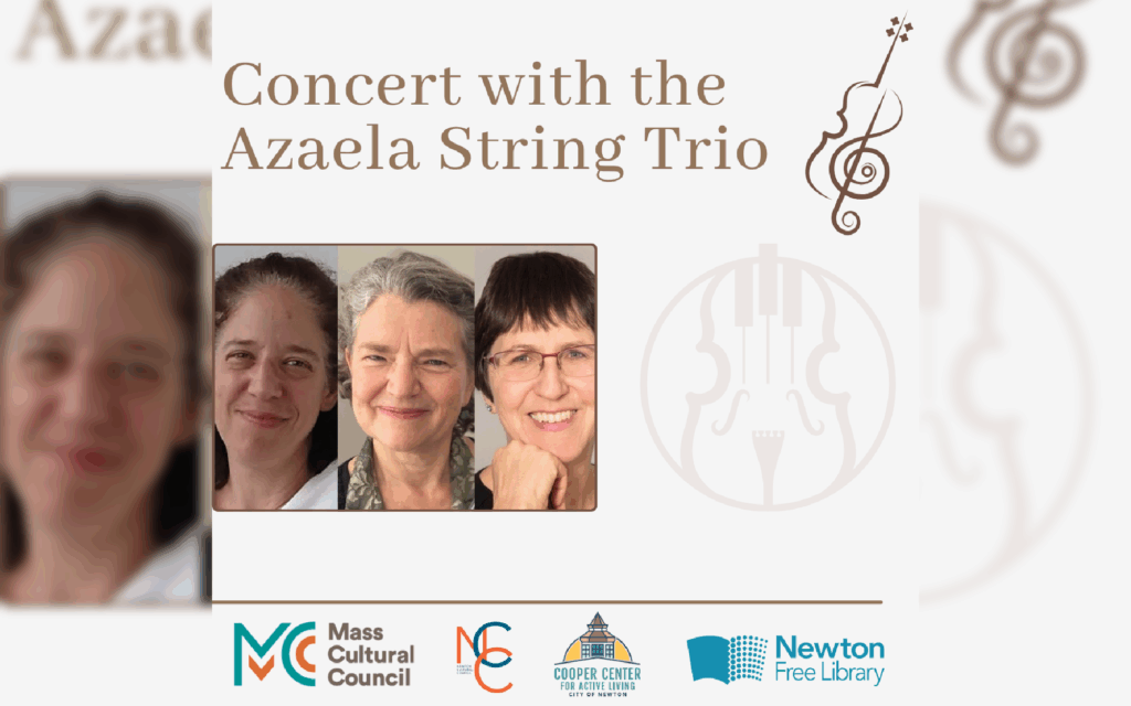 The Newton Free Library will present a Concert with the Azaela String Trio led by Deborah Boykan (violin), Jenny Stirling (viola), and Saraj Freiberg (cello). The trio will play works by Wiggins, Weston, Burleigh, Dvorak, Fisher, and White. Songs will include “Deep River,” “Goin’ Home,” “Levee Dance Op. 27, No.…