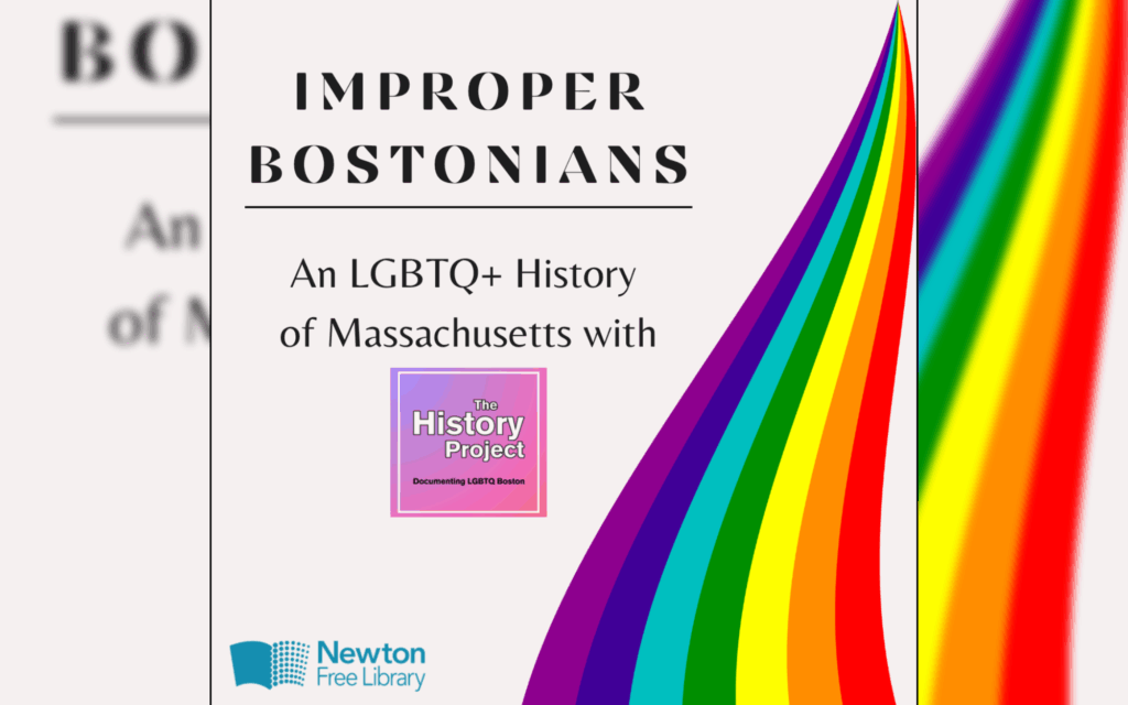 The Newton Free Library and the History Project will host an event, Improper Bostonians: An LGBTQ+ History of Massachusetts, with a presentation and conversation exploring the history of LGBTQ+ people, community, organizing, and change in Massachusetts drawing on sources like court cases, diaries, letters, photographs, videos, oral histories, and more.…