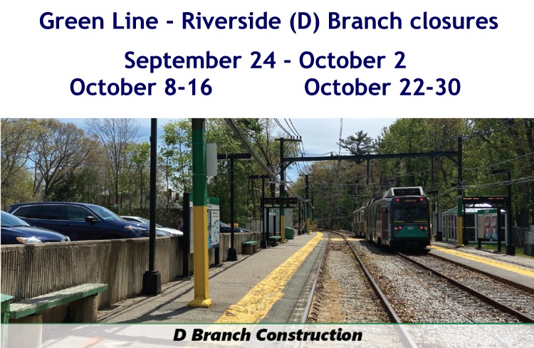 The MBTA will temporarily close the Green Line Riverside (D) branch between Kenmore and Riverside, running shuttle buses along the route (except for Beaconsfield) during these closures: September 24-October 2, October 8-16, and October 22-30. Parking lots at Waban and Eliot stations will be not be available during these closures.…